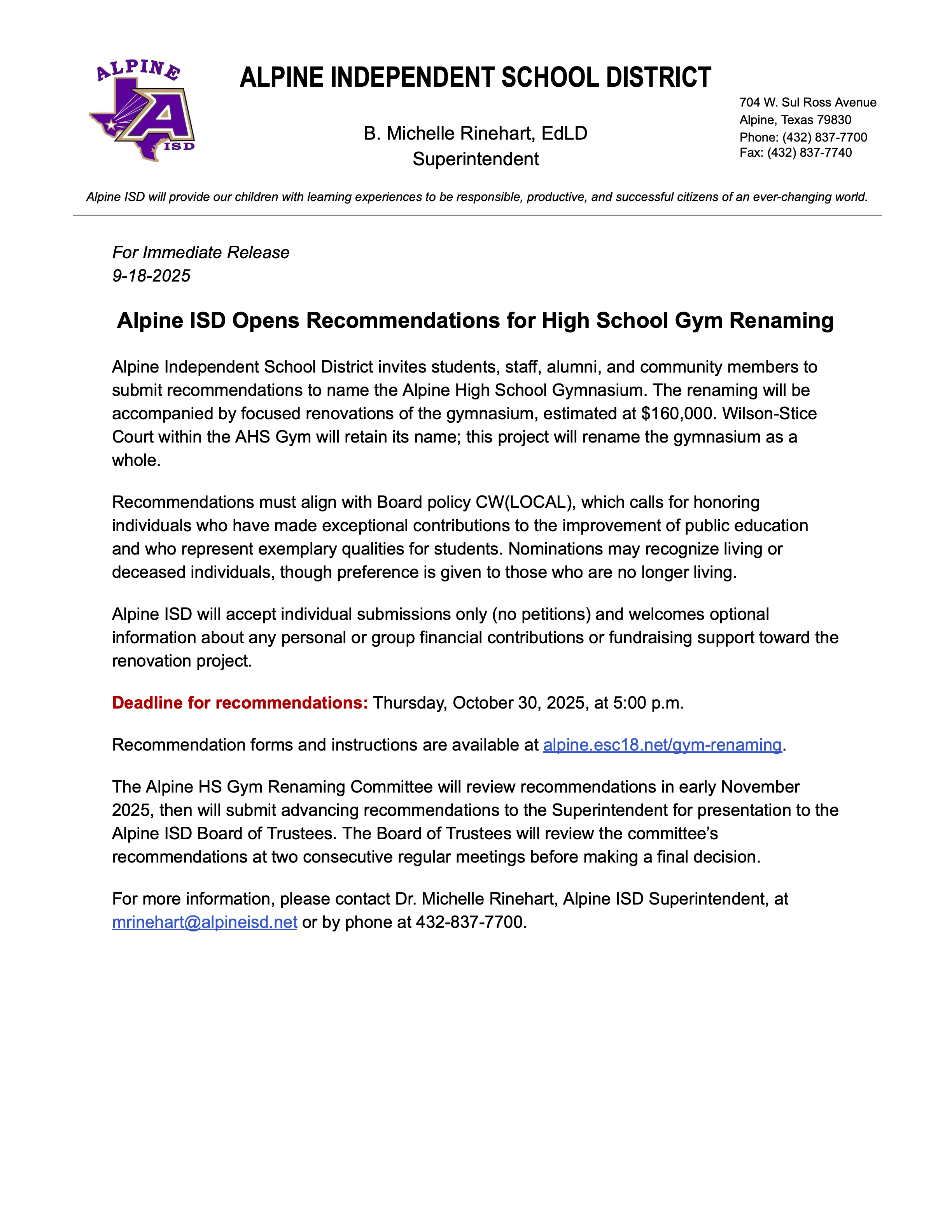 For more information, please contact Dr. Michelle Rinehart, Alpine ISD Superintendent, at mrinehart@alpineisd.net or by phone at 432-837-7700.
